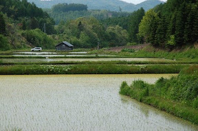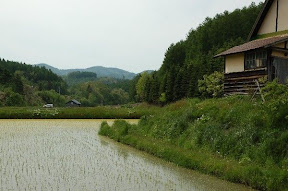 水田農家與貓:途中,由丘陵地上下來,轉彎處經一處非常有味道的日本農舍及水田,馬上下車取景,這時,轉頭便看見在田地中坐著一隻像魔女宅急便的小黑貓。